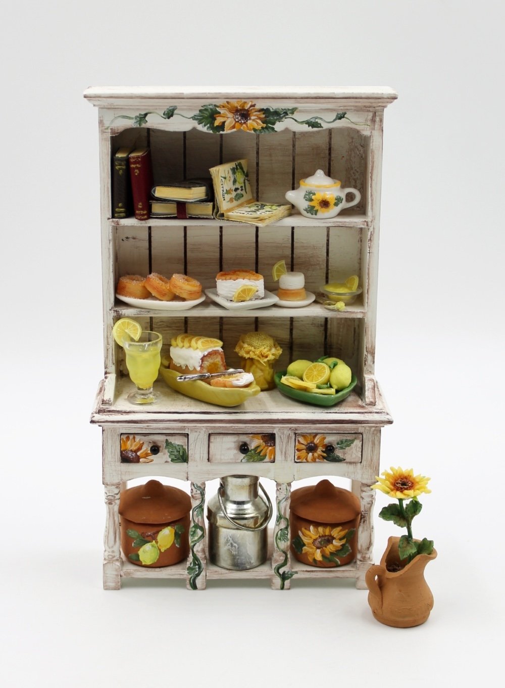 Add a touch of rustic charm to your dollhouse with this 1:12 scale miniature kitchen cabinet. Carefully hand made with attention to detail, this piece is adorned with lemon and sunflower accents and painted in a vintage inspired distressed finish, perfect for creating a cozy, farmhouse vibe.