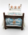 Hand made miniature bed, complete with winter themed decors. This piece is a perfect blend of artistry and craftsmanship, designed to bring a warm, rustic, country aesthetic to any miniature collection.